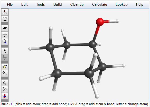 The WebMO editor is a true 3D molecular editor. The editor is used to draw the molecule to be used for computation. The editor features an intuitive, click-and-draw interface. The editor supports rotation, translation, and zooming of the structure, as well as the ability to display and/or adjust bond distances, angles, and dihedral angles. Building moderate to large molecules is easy with the editor's built-in fragment library and the ability to translate, rotate, duplicate, and delete selected portions of a molecule.