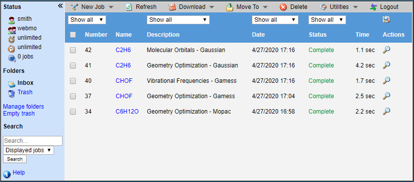 From the job manager, WebMO jobs can be started, monitored, killed, viewed, imported, downloaded, or deleted. Jobs can also be organized into user-defined folders. The job manager also provides information about the number of currenty queued WebMO jobs and any CPU time limits that have been imposed.