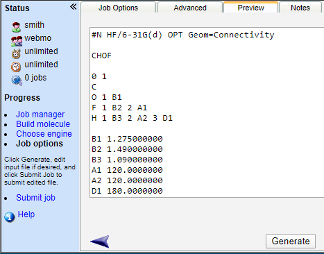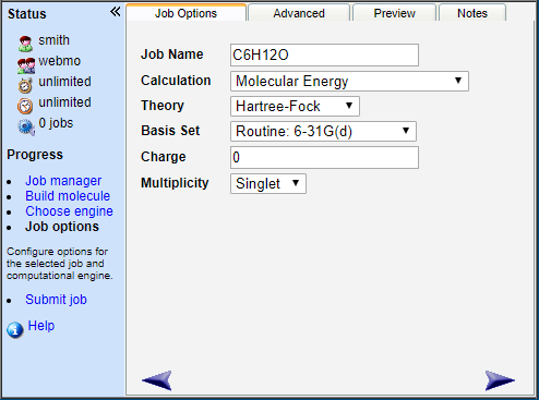WebMO offers a wide variety of jobs options which are used to specify the calculation, level of theory, and basis set for a particular job. WebMO offers reasonable suggestions for the novice, yet provides advanced users with the abilty to specify unlisted options.