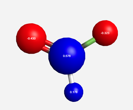 Computed values such as partial charges and dipole moment can be overlayed on the molecule.