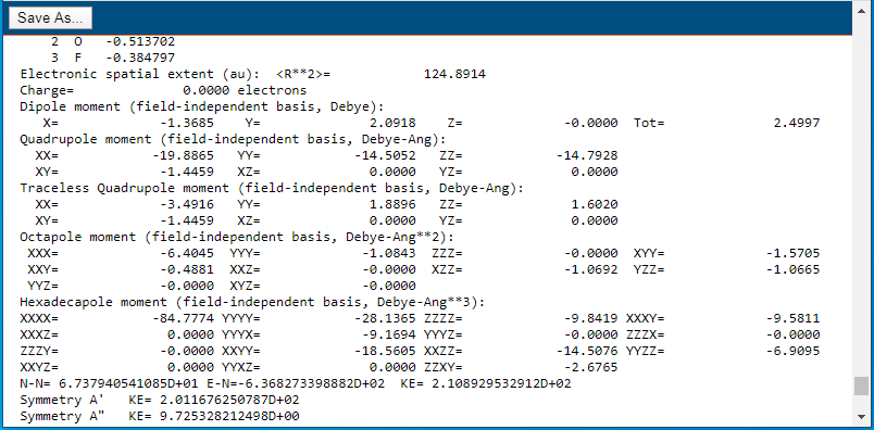 Direct access to the raw text output from the computational chemistry program is provided, allowing access to any additional properties that are not automatically parsed by WebMO.