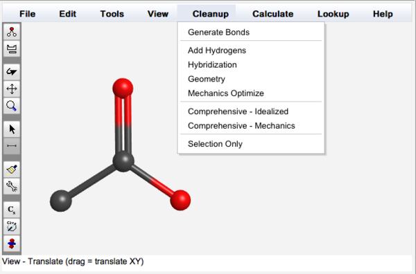 The cleanup rules are based on stable organic molecules. If one is building a transition state or radical, it is often necessary to make manual adjustments during the cleanup process. For example, one might build the molecular backbone, choose Cleanup:Add Hydrogens, manually add or delete some hydrogen atoms, choose Cleanup:Hybridization, manually adjust the hybridization of an atom, choose Cleanup Geometry, and finally manually adjust dihedral angles to obtain the desired conformation.