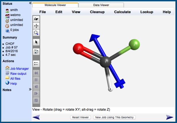 ) will display the quantity in the 3-D visualizer. The dipole moment is centered at the center of mass and its length is scaled such that 1 Debye corresponds to 1 Angstrom. Its orientation follows the chemistry convention of pointing in the negative direction.