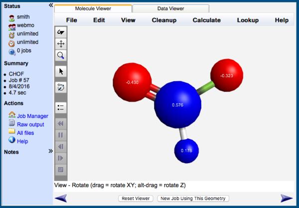 ) will display the partial charges in the 3-D visualizer. When viewing partial charge, the radius of each atom is proportional to its partial charge, and negative atoms are colored red while positive atoms are colored blue.