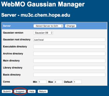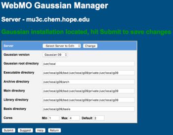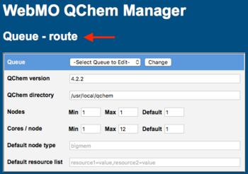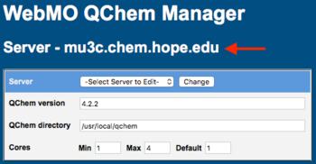 WebMO Pro and Enterprise support multiple computational servers and/or queues, each of which can run computational chemistry programs. The server or queue is displayed at the top of the {Engine} Manager page. If the desired server or queue is not displayed, then it must be chosen from the Interface Manager, after which its engines can be enabled and edited.