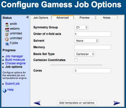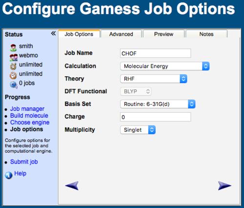 Although reasonable defaults are provided for job options, one typically needs to modify the Job Name, Calculation, Theory, and Basis Set.