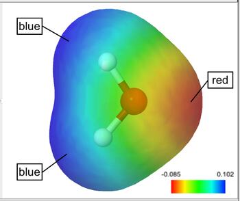 By default WebMO represents smaller values by red and larger values in blue. Thus, red represents negative regions and blue represents positive regions on an electrostatic potential surface. For example, the electrostatic potential surface on water is red (negative) around oxygen and blue (positive) around the hydrogens. A color legend is provided to illustrate how numeric values correspond to color.