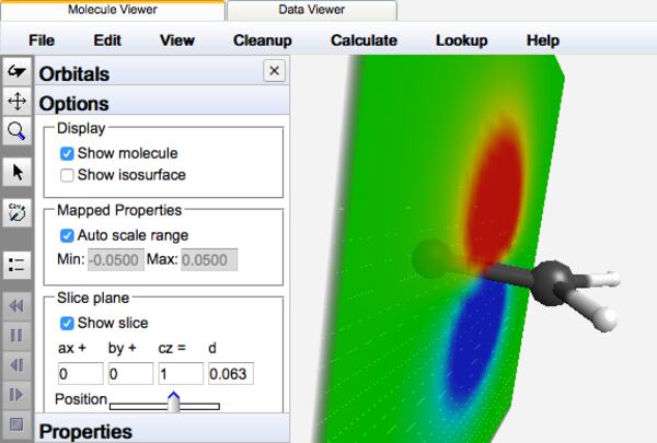 Molecular orbitals and related quantities are displayed on the View Results page in the Molecule Viewer tab of the 3-D visualizer.