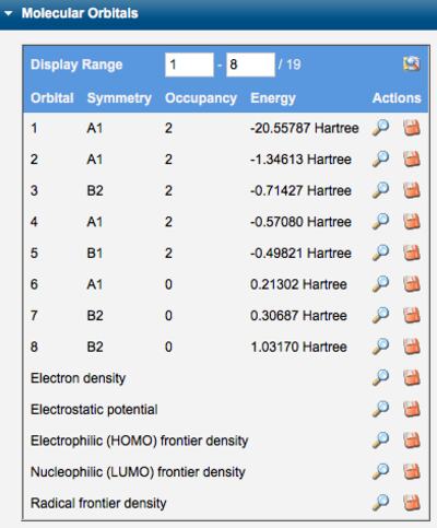 ). The electron density, electrostatic potential, and electrophilic/nucleophilic/radical frontier densities may also be displayed. The orbital definitions (basis functions and linear combination coefficients) may be saved locally by clicking the Download icon (