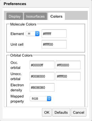 Colors of the occupied and unoccupied orbitals may be controlled in the Colors tab. Color schemes available for mapping values include RGB and Gradient. In RGB, small (negative) values are red, intermediate (zero) values are green, and large (positive) values are blue. In Gradient, intermediate (zero) values are gray.