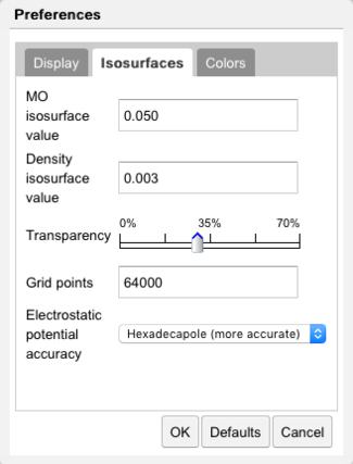 The size of the orbital is determined by the value of the isosurface to be plotted. Generally speaking a smaller isosurface value results in a larger orbital, since the orbital magnitude decreases with distance from the molecule. Isosurface values for molecular orbitals (MO) and electron density (ED) are specified in the Isosurfaces tab. The isosurface transparency may be set here. The number of grid points, which controls the smoothness of the surface, is specified here.