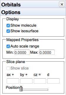 Some visual preferences for molecular orbitals may be set when molecular orbitals are being displayed from the Options accordion tab. These settings are remembered only for the current session.