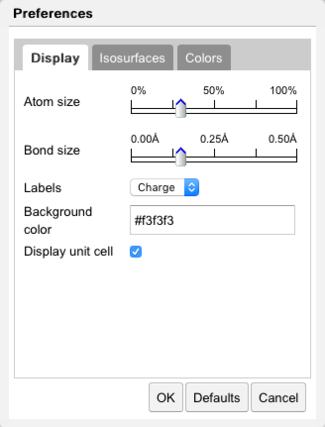 The preference dialog box for atoms, bonds, and isosurfaces is invoked with File:Preferences or on the toolbar with