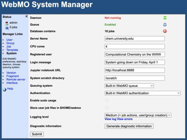 The System Manager allows the admin user to control the operation and enable various features of WebMO.