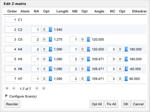 WebMO creates a Z-matrix every time atoms are added or deleted. It is sometimes necessary to edit the default Z-matrix to specify a particular coordinate for scanning or to minimize numerical sensitivity in an optimization. The WebMO Z-matrix editor allows complete control over the Z-matrix for the current molecule.