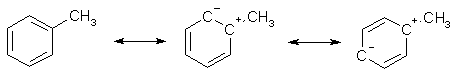 The CH3 group donates electrons to the aromatic ring due to hyperconjugation. This excess charge becomes concentrated at the ortho-para positions, as shown by the resonance structures above. Thus, these positions become activated towards electrophilic aromatic substitution, and the CH3 group is an ortho-para director, as we learned in organic chemistry.