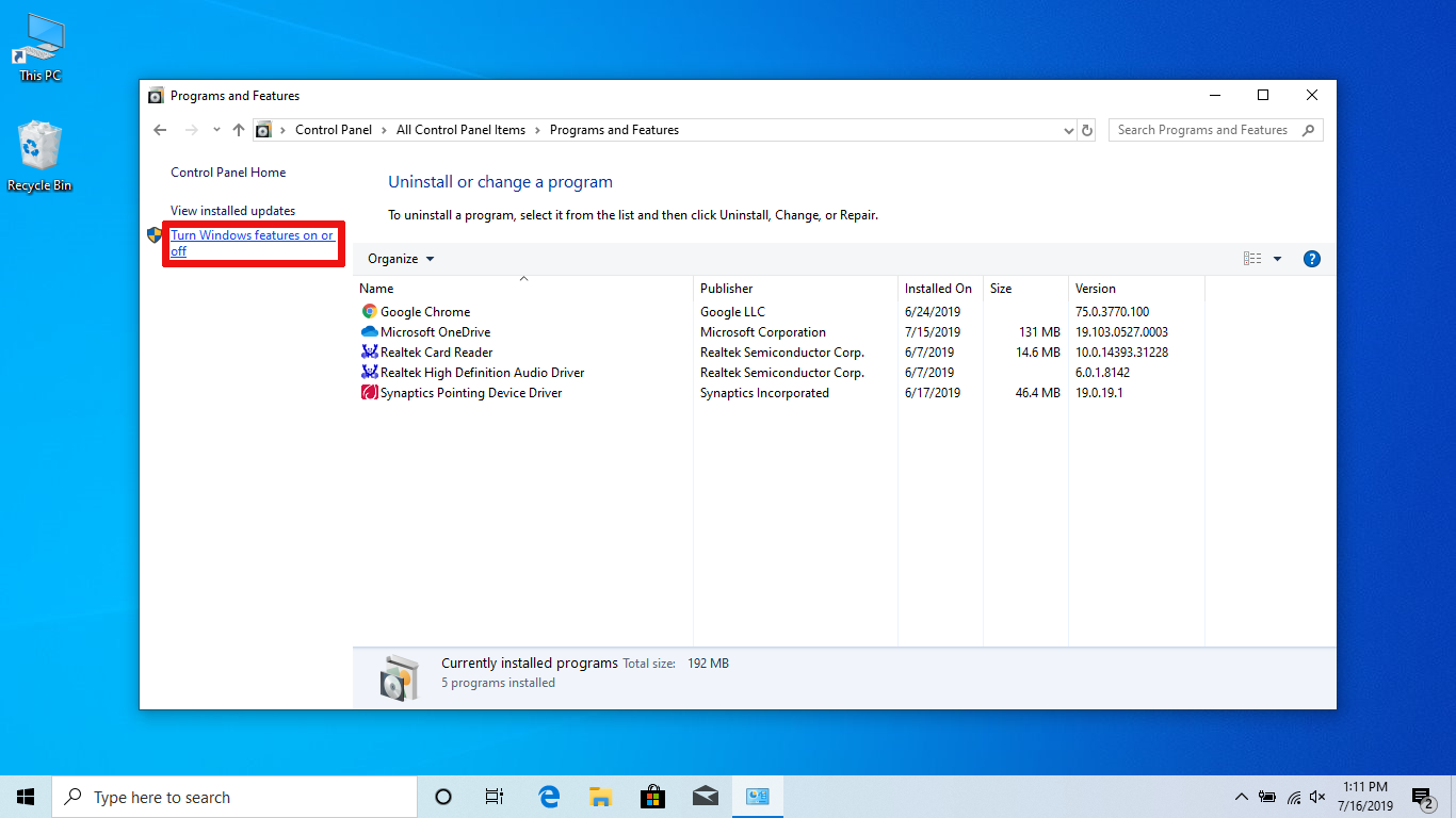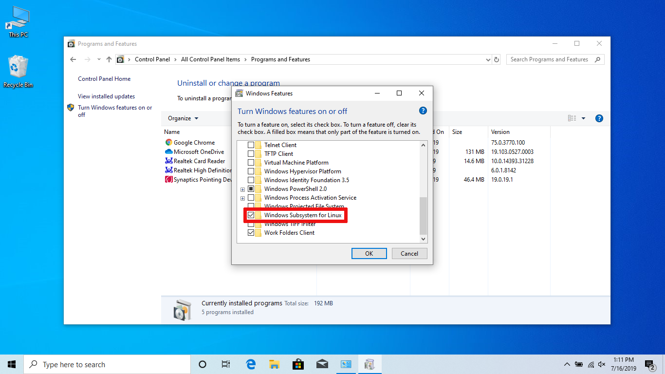 In your app search bar type "control" and hit <enter>. This will open the Control Panel. Then select View b: <Large icons>. Select <Programs and Features>. Click <Turn Windows features on or off> near the left of the page. Check Windows Subsystem for Linux, click OK, and click Restart when requested.